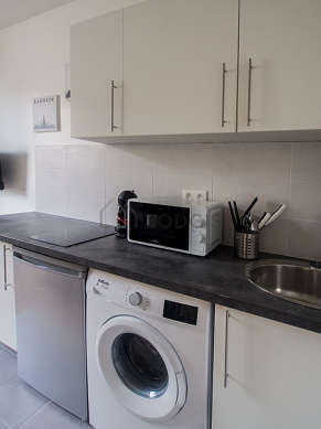 Questo appartamento dispone di una magnifica cucina con del piastrelle al suolo e tutto l'equipaggiamento necessario per la vita quotidiana : piani di cottura, frigorifero, forno microonde, caffettiera, armadio, stoviglie.