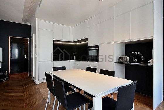 Questo appartamento dispone di una magnifica cucina con del parquet al suolo e tutto l'equipaggiamento essenziale per la vita quotidiana : piani di cottura, frigorifero, congelatore, forno, forno microonde, tostapane, tavola da pranzo, scaffale, armadio, stoviglie, 1 sedia (e).