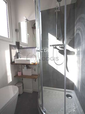 Questo appartamento é equipaggiato di un bagno magnifica e molto chiaro. Questo bagno é dotato di tutto il necessario per il tuo benessere quotidiano : doccia, sink, radiatore porta asciugamani. Il WC é integrato nel bagno