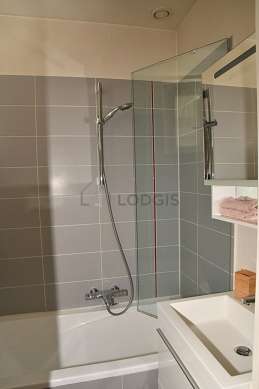 Questa casa é equipaggiata di un bagno magnifica e molto chiaro. Questo bagno é dotato di tutto il necessario per il tuo benessere quotidiano : asciugamani da bagno, scaffale, vasca da bagno, asciugacapelli, sink, mirror, towel rack, bin, radiatore porta asciugamani, carpet. Il WC é integrato nel bagno