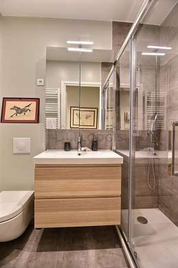 Questo appartamento é equipaggiato di un bagno magnifica. Questo bagno é dotato di tutto il necessario per il tuo benessere quotidiano : scaffale, armadio, doccia, sink, radiatore porta asciugamani. Il WC é integrato nel bagno