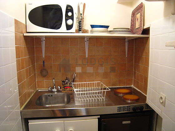 Questo appartamento dispone di una cucina con del piastrelle al suolo e tutto l'equipaggiamento indispensabile per la vita quotidiana : piani di cottura, frigorifero, forno microonde, congelatore, tostapane, scaffale, armadio, stoviglie.