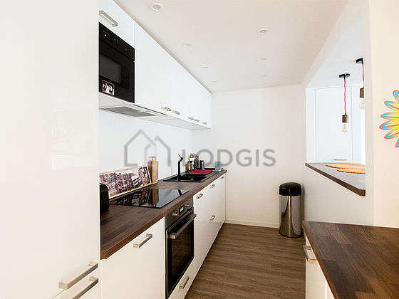 Questo appartamento dispone di una magnifica cucina con del parquet al suolo e tutto l'equipaggiamento necessario per la vita quotidiana : piani di cottura, frigorifero, congelatore, forno microonde, cappa di aspirazione, tostapane, bollitore elettrico, caffettiera, scaffale, armadio, stoviglie, sgabello, bar.