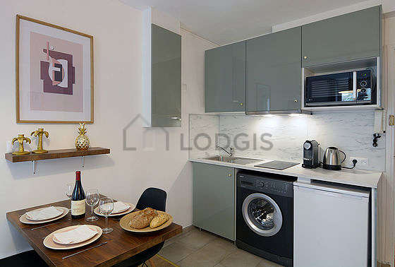 Questo appartamento dispone di una cucina adiacent al soggiorno con del piastrelle al suolo e tutto l'equipaggiamento indispensabile per la vita quotidiana : piani di cottura, frigorifero, forno microonde, bollitore elettrico, caffettiera, armadio, stoviglie.