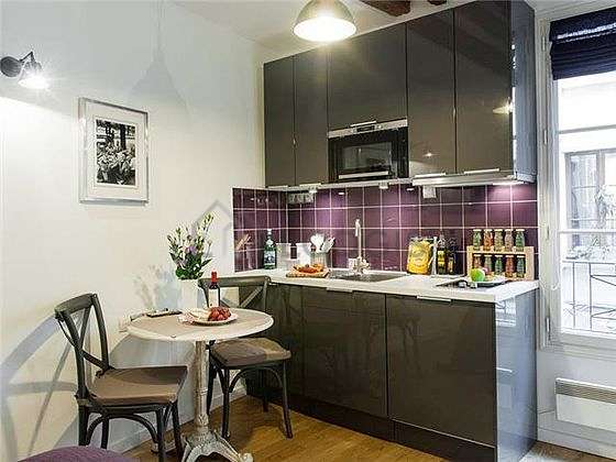 Questo appartamento dispone di una cucina con del parquet al suolo e tutto l'equipaggiamento essenziale per la vita quotidiana : piani di cottura, frigorifero, microonde multifunzione, congelatore, tostapane, tavola da pranzo, scaffale, armadio, stoviglie.