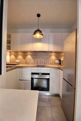 Questo appartamento dispone di una magnifica cucina con del piastrelle al suolo e tutto l'equipaggiamento indispensabile per la vita quotidiana : piani di cottura, frigorifero, congelatore, forno, tostapane, scaffale, armadio, stoviglie.