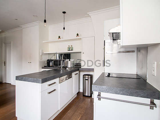 Questo appartamento dispone di una magnifica cucina con del parquet al suolo e tutto l'equipaggiamento indispensabile per la vita quotidiana : piani di cottura, frigorifero, forno, forno microonde, cappa di aspirazione, tostapane, bollitore elettrico, caffettiera, scaffale, armadio, stoviglie, bar.