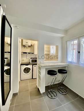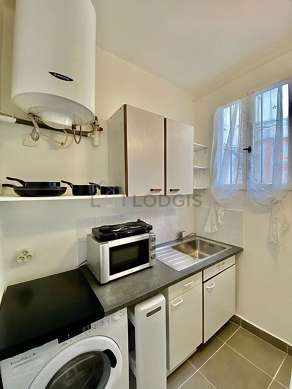 Questo appartamento dispone di una bella cucina adiacent al soggiorno con del piastrelle al suolo e tutto l'equipaggiamento essenziale per la vita quotidiana : piani di cottura, frigorifero, forno microonde, bollitore elettrico, caffettiera, tavola da pranzo, scaffale, armadio, stoviglie, 2 sedia (e).