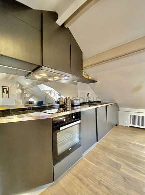 Questo appartamento dispone di una magnifica cucina con del parquet al suolo e tutto l'equipaggiamento essenziale per la vita quotidiana : piani di cottura, frigorifero, forno, congelatore, cappa di aspirazione, tostapane, bollitore elettrico, scaffale, armadio, stoviglie, bin.