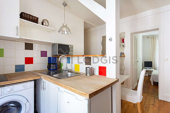 Questo appartamento dispone di una bella cucina con del parquet al suolo e tutto l'equipaggiamento necessario per la vita quotidiana : piani di cottura, frigorifero, forno microonde, congelatore, guardaroba, armadio, armadio, stoviglie.