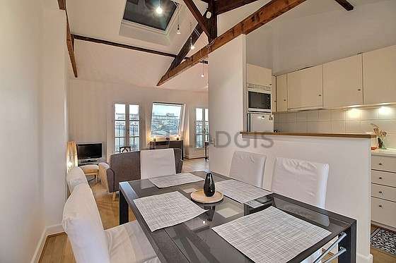 Questo appartamento dispone di una magnifica cucina con del parquet al suolo e tutto l'equipaggiamento essenziale per la vita quotidiana : frigorifero, forno, cappa di aspirazione, tostapane, caffettiera, tavola da pranzo, stoviglie, 4 sedia (e), bar.