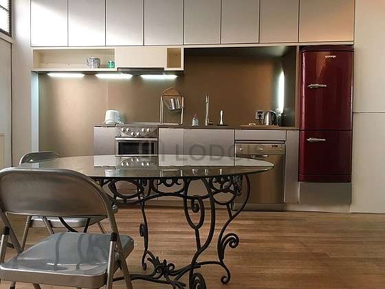 Questo appartamento dispone di una cucina adiacent al soggiorno con del parquet al suolo e tutto l'equipaggiamento necessario per la vita quotidiana : piani di cottura, frigorifero, congelatore, forno, tostapane, bollitore elettrico, caffettiera, scaffale, como', armadio, stoviglie.
