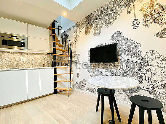 SoggiornoQuesto duplex é composto di un bello salone con del parquet al suolo e delle finestras anti-rumore. Questo salone calmo é ammobiliato e equipaggiato per rendere il tuo soggiorno piacevole : televisione, coperte, divano, tavola da pranzo, scaffale, armadio, sgabello, bin.