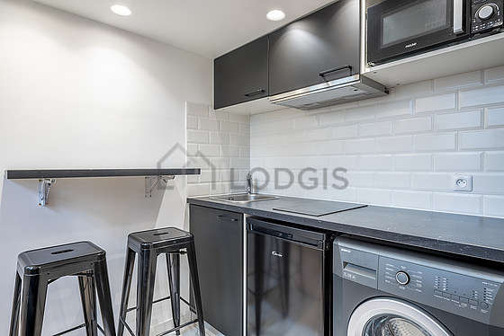 Questo appartamento dispone di una cucina e tutto l'equipaggiamento indispensabile per la vita quotidiana : piani di cottura, frigorifero, forno microonde, cappa di aspirazione, scaffale, armadio, stoviglie, sgabello.