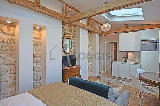 SoggiornoQuesto appartamento é composto di un magnifico salone con del parquet al suolo. Questo salone molto calmo é ammobiliato e equipaggiato per rendere il tuo soggiorno piacevole : televisione, lenzuola, coperte, frigorifero, divano, tavola da pranzo, tavolino, scrivania, guardaroba, scaffale, como', armadio, stoviglie, pietre visibili, trave, 1 sedia (e), comodino, mirror, bin1 letto.