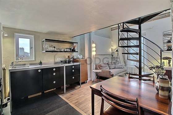 Questo appartamento dispone di una magnifica cucina con del parquet al suolo e tutto l'equipaggiamento necessario per la vita quotidiana : piani di cottura, frigorifero, congelatore, forno, cappa di aspirazione, tostapane, bollitore elettrico, caffettiera, tavola da pranzo, scaffale, armadio, stoviglie, 4 sedia (e).