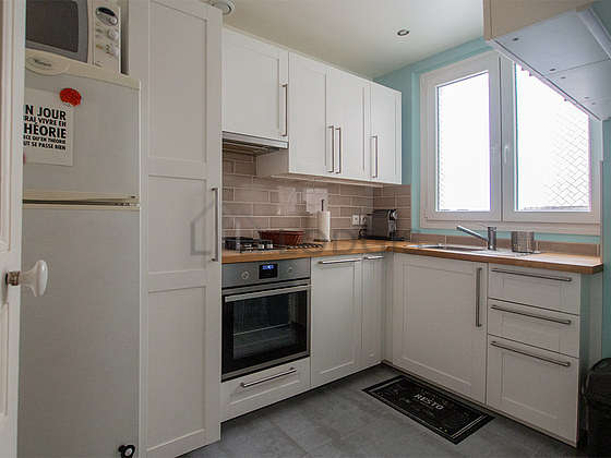 Questo appartamento dispone di una magnifica cucina con del piastrelle al suolo e tutto l'equipaggiamento essenziale per la vita quotidiana : piani di cottura, frigorifero, congelatore, forno, forno microonde, cappa di aspirazione, tostapane, bollitore elettrico, caffettiera, tavola da pranzo, scaffale, armadio, stoviglie, sgabello.