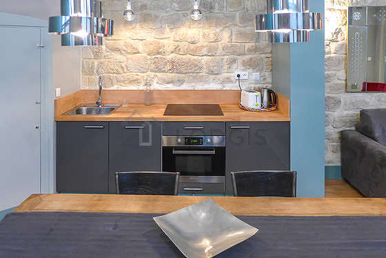 Questo appartamento dispone di una magnifica cucina con del parquet al suolo e tutto l'equipaggiamento essenziale per la vita quotidiana : frigorifero, forno, forno microonde, tostapane, como', armadio, stoviglie.
