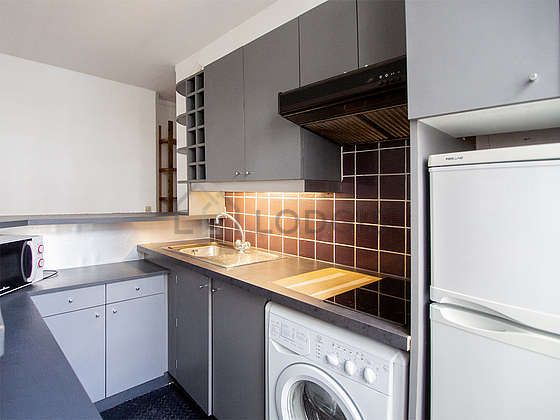 Questo appartamento dispone di una bella cucina con del piastrelle al suolo e tutto l'equipaggiamento necessario per la vita quotidiana : piani di cottura, frigorifero, congelatore, forno microonde, cappa di aspirazione, armadio, stoviglie, sgabello, bar.