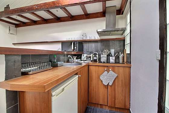Questo appartamento dispone di una magnifica cucina con del piastrelle al suolo e tutto l'equipaggiamento necessario per la vita quotidiana : piani di cottura, frigorifero, forno microonde, cappa di aspirazione, tostapane, caffettiera, stoviglie.