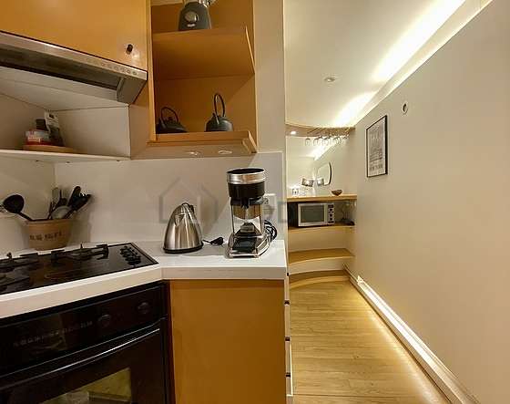 Questo appartamento dispone di una magnifica cucina adiacent al soggiorno con del parquet al suolo e tutto l'equipaggiamento essenziale per la vita quotidiana : piani di cottura, frigorifero, congelatore, forno, forno microonde, cappa di aspirazione, tostapane, bollitore elettrico, caffettiera, scaffale, armadio, stoviglie, robot da cucina, bar, soup plates, dessert plates, plates, bowl, casserole dish, cooking knives, bread knife, lid, cutlery, wooden spoon, hot plate, peeler, salad mixer, whisk, lamp, ladle, mixer, cake tin, mugs, sieve, chopping board, work surface, baking dish, stove, bin, ceiling light, coffee cups, tea cups, champagne glass, water glass, wine glass.