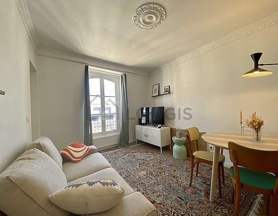 SoggiornoQuesto appartamento é composto di un superbo salone con del parquet al suolo e delle finestras anti-rumore. Questo salone molto calmo é ammobiliato e equipaggiato per rendere il tuo soggiorno piacevole : televisione, divano, tavola da pranzo, 3 sedia (e), tv stand, curtains, painting, carpet.
