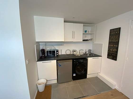 Questo appartamento dispone di una cucina adiacent al soggiorno e tutto l'equipaggiamento indispensabile per la vita quotidiana : piani di cottura, frigorifero, congelatore, forno microonde, caffettiera, scaffale, armadio, stoviglie.