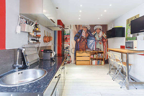 Questo appartamento dispone di una magnifica cucina con del parquet al suolo e tutto l'equipaggiamento necessario per la vita quotidiana : piani di cottura, frigorifero, congelatore, forno microonde, cappa di aspirazione, caffettiera, tavola da pranzo, scaffale, armadio, stoviglie, 2 sedia (e).