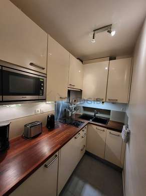 Questo appartamento dispone di una magnifica cucina con del piastrelle al suolo e tutto l'equipaggiamento indispensabile per la vita quotidiana : piani di cottura, frigorifero, congelatore, forno microonde, congelatore, cappa di aspirazione, tostapane, bollitore elettrico, caffettiera, armadio, stoviglie.