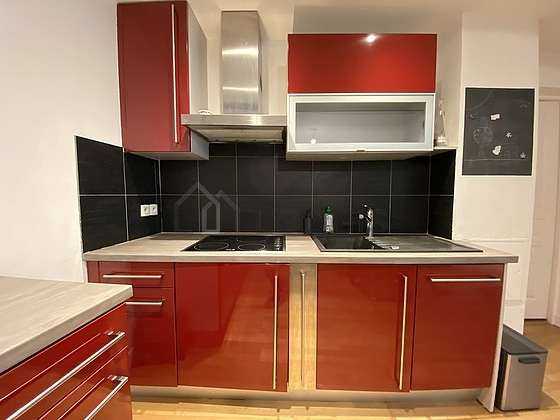 Questo appartamento dispone di una bella cucina adiacent al soggiorno con del parquet al suolo e tutto l'equipaggiamento essenziale per la vita quotidiana : piani di cottura, frigorifero, congelatore, forno, forno microonde, cappa di aspirazione, tostapane, bollitore elettrico, caffettiera, scaffale, armadio, stoviglie.