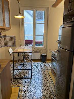 Questo appartamento dispone di una cucina e tutto l'equipaggiamento essenziale per la vita quotidiana : piani di cottura, frigorifero, forno, congelatore, bollitore elettrico, caffettiera, tavola da pranzo, scaffale, armadio, stoviglie, 1 sedia (e), mixer.