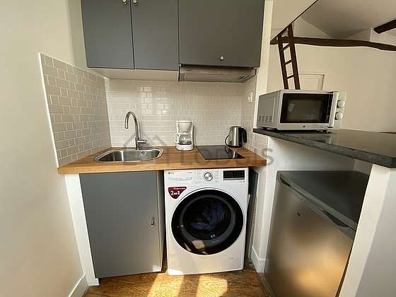 Questo appartamento dispone di una magnifica cucina con del parquet al suolo e tutto l'equipaggiamento indispensabile per la vita quotidiana : piani di cottura, frigorifero, congelatore, microonde multifunzione, cappa di aspirazione, caffettiera, armadio, stoviglie.