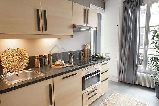 Questo appartamento dispone di una cucina e tutto l'equipaggiamento indispensabile per la vita quotidiana : piani di cottura, frigorifero, congelatore, forno, forno microonde, congelatore, tostapane, tavola da pranzo, armadio, stoviglie.