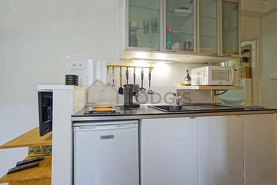 Questo appartamento dispone di una magnifica cucina con del parquet al suolo e tutto l'equipaggiamento necessario per la vita quotidiana : piani di cottura, frigorifero, congelatore, forno microonde, caffettiera, armadio, stoviglie, sgabello, coat stand, bin.