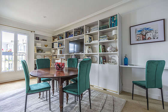 Per condividere un pasto conviviale durante il tuo soggiorno a Parigi, questo appartamento dispone di una sala da pranzo grazie a televisione, tavola da pranzo, biblioteca, 1 sedia (e).