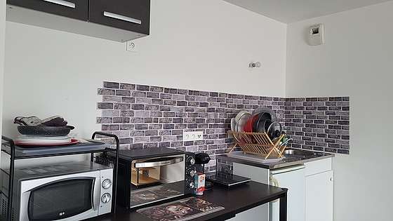 Questo appartamento dispone di una magnifica cucina con del piastrelle al suolo e tutto l'equipaggiamento necessario per la vita quotidiana : piani di cottura, frigorifero, forno microonde, bollitore elettrico, caffettiera, armadio, stoviglie.
