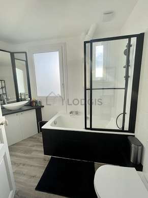 Questo appartamento é equipaggiato di un bagno. Questo bagno é dotato di tutto il necessario per il tuo benessere quotidiano : asciugamani da bagno, scaffale, vasca da bagno, asciugacapelli, sink, mirror, towel rack, bin, radiatore porta asciugamani, painting, ventilator. Il WC é integrato nel bagno