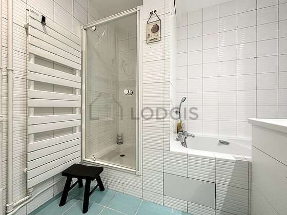 Questo appartamento é equipaggiato di un bagno piacevole e chiaro. Questo bagno é dotato di tutto il necessario per il tuo benessere quotidiano : armadio, vasca da bagno, doccia, sink, radiatore porta asciugamani. Il WC é separato dal bagno ed é situato in un locale indipendente.