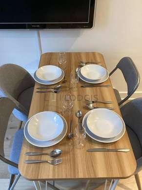 SoggiornoQuesto appartamento é composto di un bello salone con del parquet al suolo e delle finestras. Questo salone calmo é ammobiliato e equipaggiato per rendere il tuo soggiorno piacevole : televisione, divano, tavola da pranzo, scrivania1 divano letto.