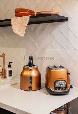 Questo appartamento dispone di una magnifica cucina con del piastrelle al suolo e tutto l'equipaggiamento essenziale per la vita quotidiana : frigorifero, forno, microonde multifunzione, tostapane, bollitore elettrico, caffettiera, stoviglie.