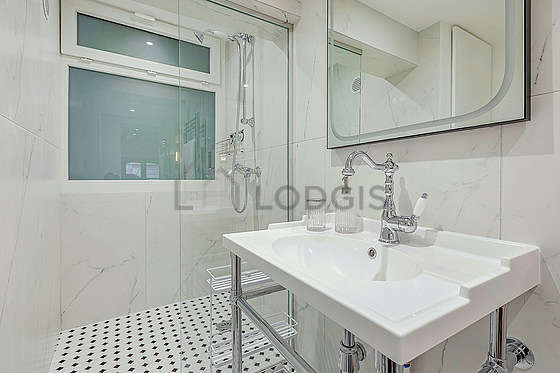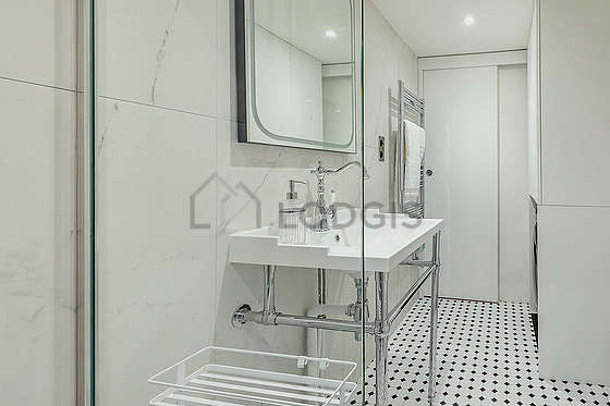 Questo appartamento é equipaggiato di un bagno piacevole e chiaro. Questo bagno é dotato di tutto il necessario per il tuo benessere quotidiano : asciugamani da bagno, ferro da stiro, scaffale, armadio, doccia, asciugacapelli, airer, sink, mirror, bin, radiatore porta asciugamani, painting, carpet. Il WC é integrato nel bagno