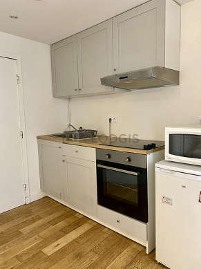 Questo appartamento dispone di una cucina adiacent al soggiorno e tutto l'equipaggiamento indispensabile per la vita quotidiana : frigorifero, forno, forno microonde, cappa di aspirazione, caffettiera, drying up stand, work surface.