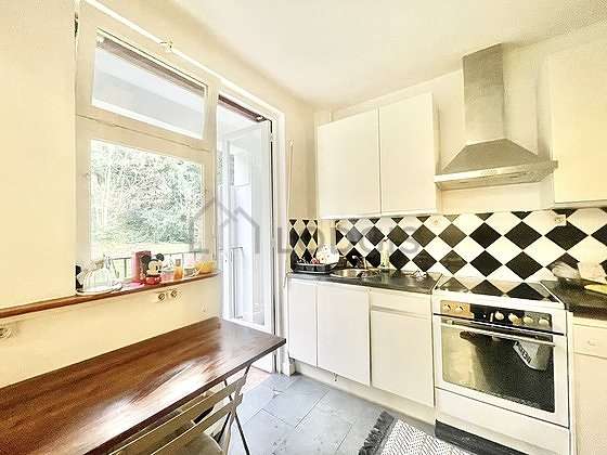 Questo appartamento dispone di una cucina con del piastrelle al suolo e tutto l'equipaggiamento essenziale per la vita quotidiana : piani di cottura, frigorifero, forno, cappa di aspirazione, tavola da pranzo, 1 sedia (e).