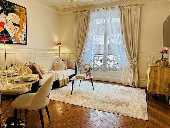 Per condividere un pasto conviviale durante il tuo soggiorno parigino, questo appartamento dispone di una sala da pranzo grazie a televisione, divano, tavola da pranzo, 4 sedia (e), chandelier, curtains, painting, carpet.