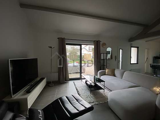 Questa casa é composta di un salone con del piastrelle al suolo e delle finestras anti-rumore. Questo salone é ammobiliato e equipaggiato per rendere il tuo soggiorno piacevole : televisione, divano, 1 poltrona (e), tavola da pranzo, tavolino, 1 sedia (e), floor lamp, vase.