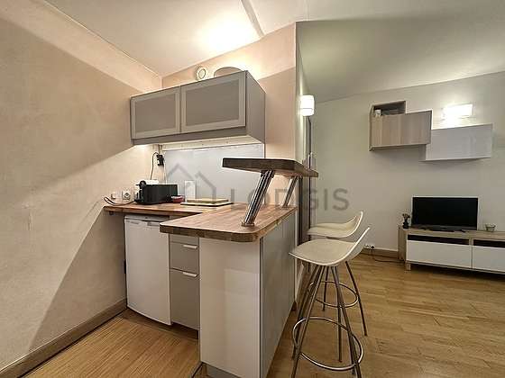 Questo appartamento dispone di una cucina con del parquet al suolo e tutto l'equipaggiamento essenziale per la vita quotidiana : piani di cottura, frigorifero, microonde multifunzione, congelatore, tostapane, bollitore elettrico, caffettiera, armadio, sink.