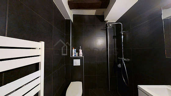 Questo appartamento é equipaggiato di un bagno piacevole. Questo bagno é dotato di tutto il necessario per il tuo benessere quotidiano : asciugamani da bagno, scaffale, armadio, doccia, trave, asciugacapelli, sink, mirror, towel rack, bin, radiatore porta asciugamani, ventilator. Il WC é integrato nel bagno