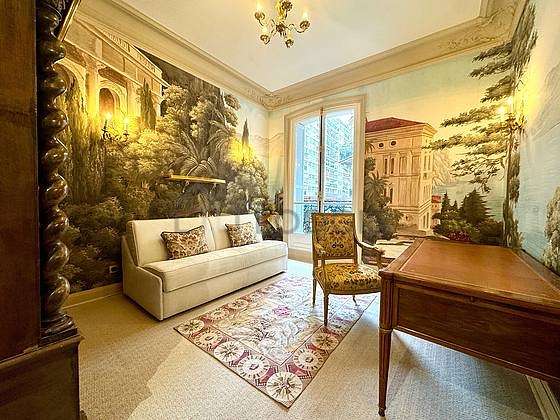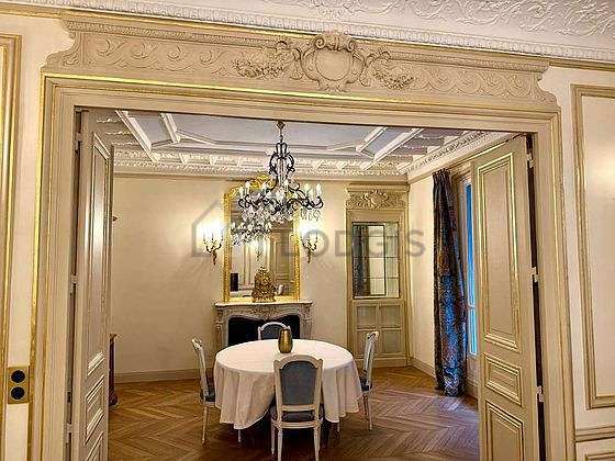 Per condividere un pasto conviviale durante il tuo soggiorno parigino, questo appartamento dispone di una sala da pranzo grazie a tavola da pranzo, camino, 4 sedia (e), chandelier, mirror, curtains.