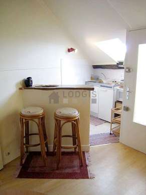 Questo appartamento dispone di una cucina adiacent al soggiorno con del piastrelle al suolo e tutto l'equipaggiamento necessario per la vita quotidiana : piani di cottura, frigorifero, forno microonde, congelatore, bollitore elettrico, caffettiera, scaffale, armadio, stoviglie, sgabello, bar.
