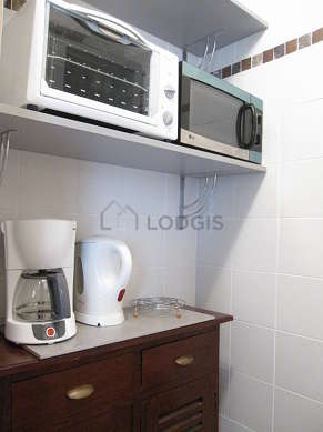 Questo appartamento dispone di una cucina con del piastrelle al suolo e tutto l'equipaggiamento necessario per la vita quotidiana : piani di cottura, frigorifero, forno, forno microonde, congelatore, cappa di aspirazione, tostapane, bollitore elettrico, caffettiera, scaffale, armadio, stoviglie.